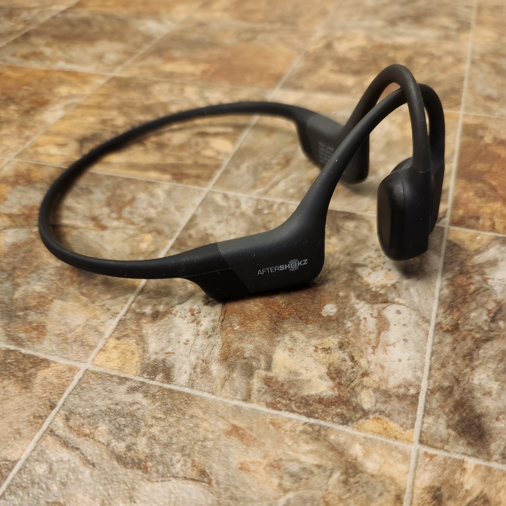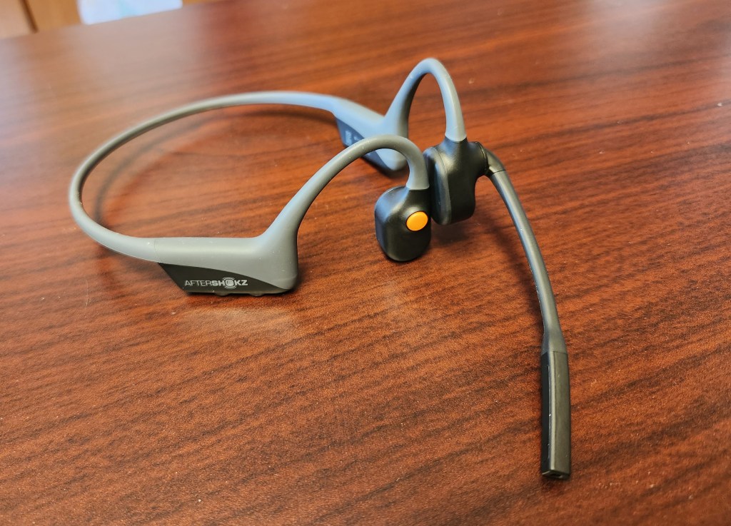 Bone conduction headphones don’t go inside your ears but instead sit slightly above the ears against your temple. They work by sending sound vibrations though the skull to the ear. I love my bone conduction headphones because I can wear them and still be able to interact with people around me or hear traffic as I am cycling. I also find I just really hate having something blocking the sound in my remaining ear. They are super comfortable. I like them so much I also needed a bone conduction phone headset.